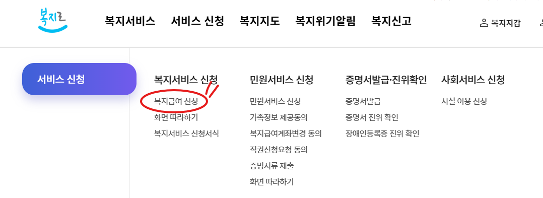 ✔️ 복지로 앱, 사이트 -> 로그인 -> 서비스 신청 -> 복지서비스 신청 -> 복지급여 신청 -> 신청 대상 서비스 선택 -> 신청서 작성 -> 최종 제출